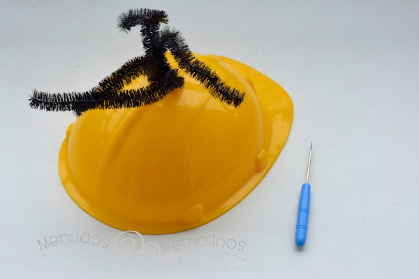 Lo primero que haremos será con un punzón hacer agujeros en el casco y clavar los limpapipas. Como llevan un alambre, los doblamos un poquito por debajo para que no se salgan. Luego podemos taparlos con un trocito de fieltro