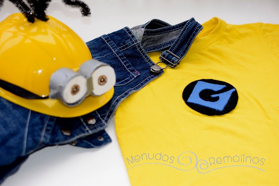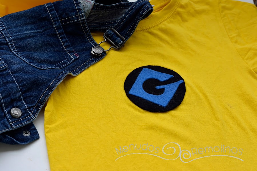 Sólo nos queda hacer el logo de los Minions en fieltro y pegarlo a una camiseta amarilla. Y por supuesto, hacernos con un peto vaquero.