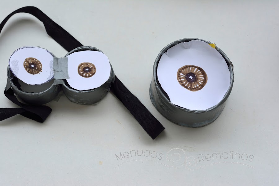 Pegamos la cartulina a las gafas que hemos forrado. Yo os recomiendo usar pegamento fuerte o bien pistola de silicona, porque con la cinta americana el papel no pega bien.