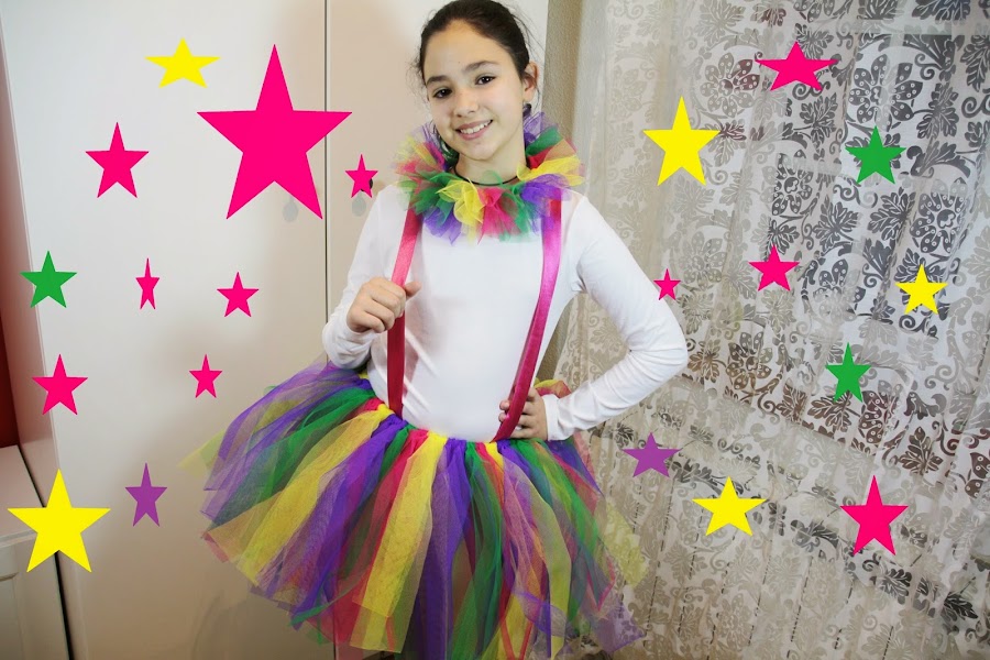 Unos tirantes muy sencillos completan el disfraz. No tenemos más que pintarnos unos coloretes y colocarnos una peluca de colores para disfrutar del Carnaval.
