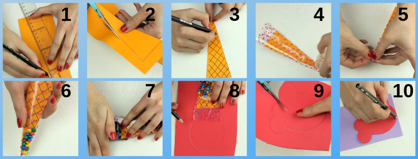 1. Cogemos una cartulina rectangular y dibujamos sobre ella, con la ayuda del lápiz y una regla, la forma de un cono. Dependiendo cómo hagas de grande el cono así será el dulcero. A continuación, recortamos la figura.