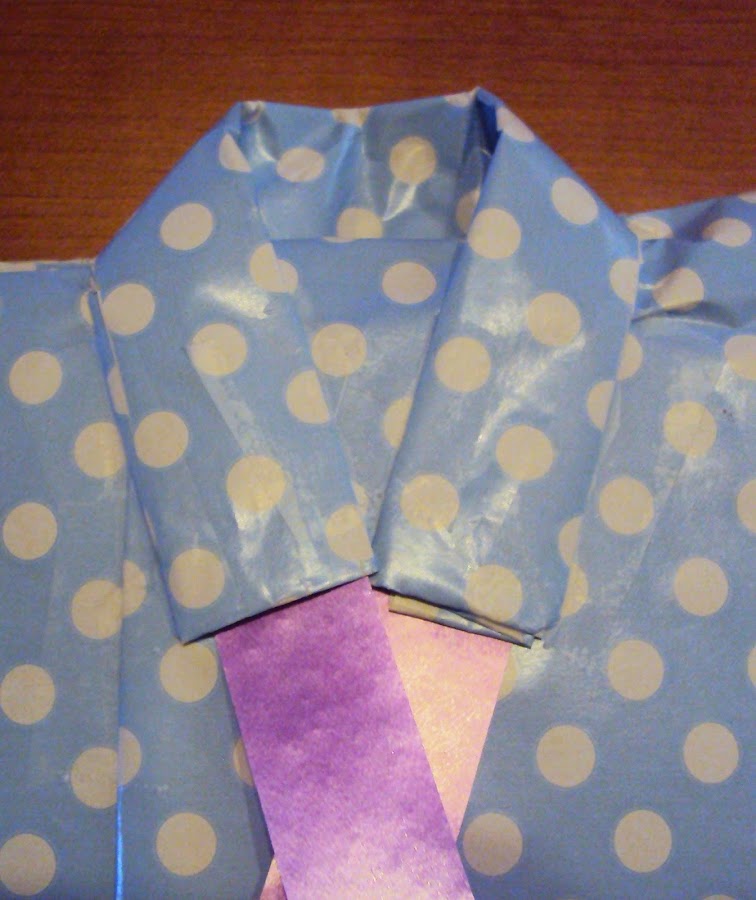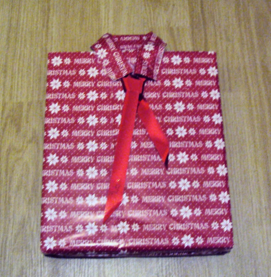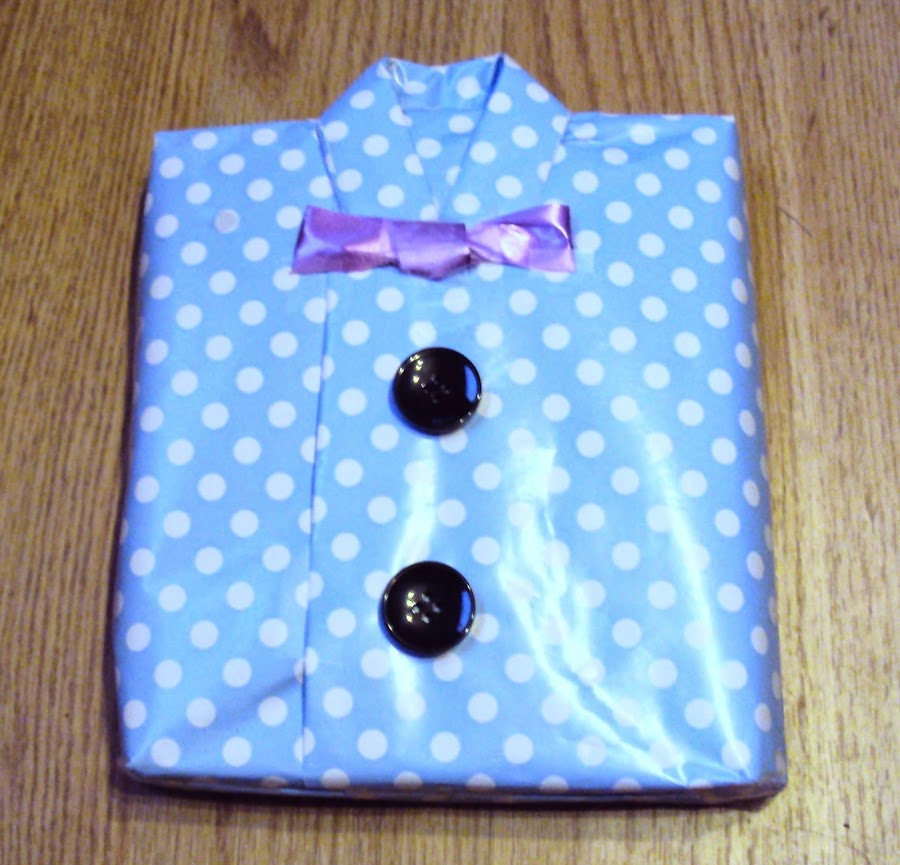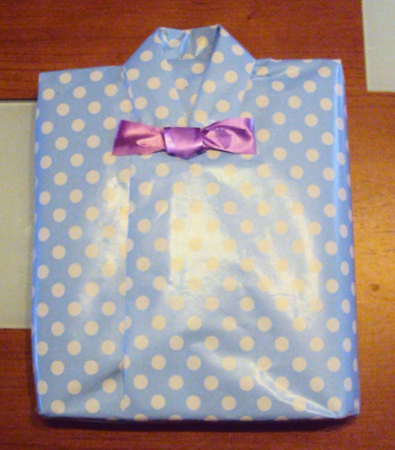 Se trata de un envoltorio como los de toda la vida pero en uno de sus extremos lo variamos un poco y queda una preciosa camisa, con corbata o pajarita.