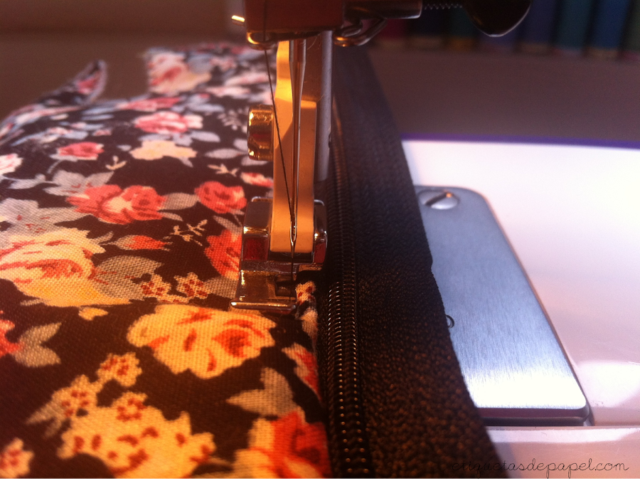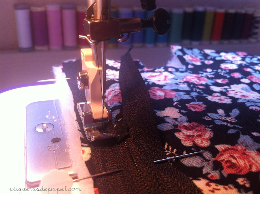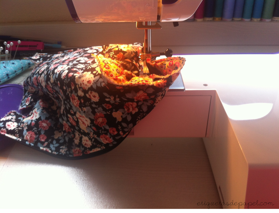 Abriremos la cremallera entera (¡muy importante!) y coseremos las dos partes que en nuestra plantilla ponía "costura de la cremallera" y luego le daremos la vuelta para coser la parte superior de la cremallera (como siempre hacemos). En este caso he quitado el brazo de mi máquina de coser para que fuera más cómodo ya que al ser una pieza pequeña es un poquito más complicado coserlo con el brazo colocado.