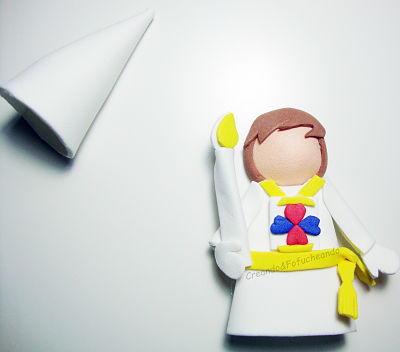 La vela más sencilla imposible: goma eva blanca y un cachito amarillo pa hacer la llama.
