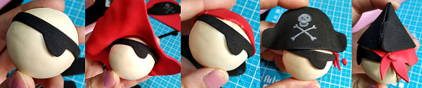 Luego pegamos el parche en su sitio en la cabeza y forramos la parte superior con el rojo, para que haga de pañuelo. Pegamos el sombrero. La parte de delante, la de detrás y luego las unimos entre ellas. Y luego con los sobrantes del rojo recortamos y pegamos unas minipiezas a modo del nudo del lazo del pañuelo.