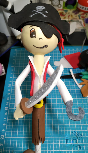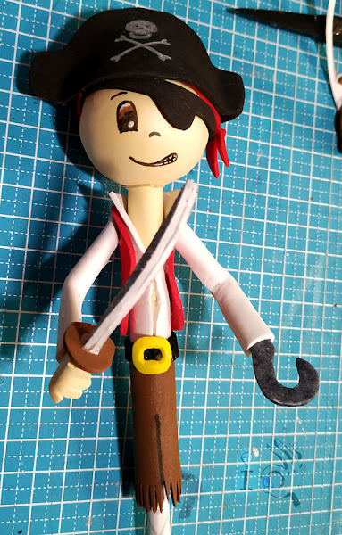 Ahora sí ya podemos pasar a pegar todas las piezas y pintarle la cara con rotuladores permanentes a este pirata tan fiero. Un ojo (la ventaja del parche es que no tienes que pintar el otro igual) la nariz y esa boca enseñando los dientes... y listo!!!