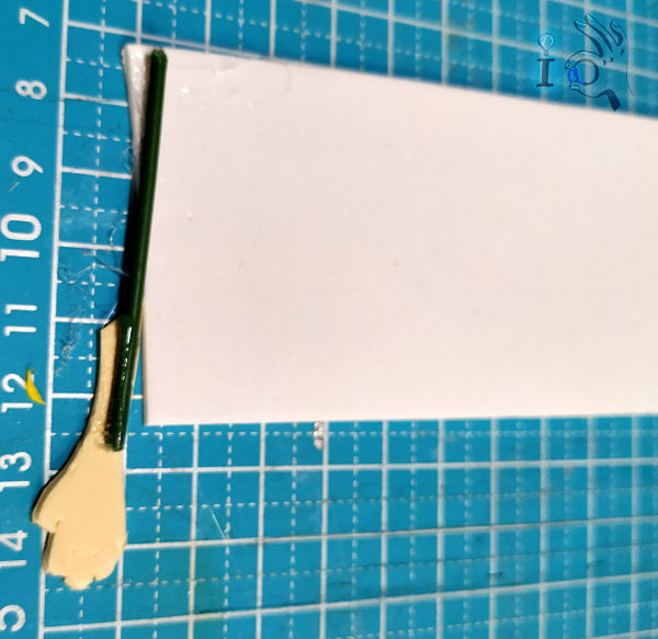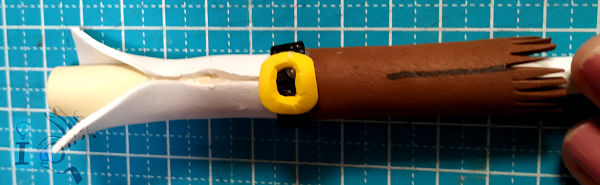 Ya sólo nos quedan los brazos. Recortamos una mano y un garfio (un fiero pirata siempre ha perdido una mano en alguna batalla) y pegamos la mano en un alambre grueso. De este modo luego podremos doblar el brazo y ponerlo en la posición que queramos. Recortamos un rectángulo blanco y lo pegamos alrededor del alambre.
