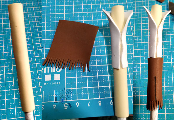 De momento tenemos lista la cabeza, así que vamos a seguir con el cuerpo. Comenzamos forrando el lápiz de color carne. Luego con un rectángulo blanco (bien medido) vamos a hacer la camisa, pegando la abertura en la parte de delante y dejando sin pegar la parte superior, como si tuviera abierto el cuello de la camisa. Para el pantalón cogemos un rectángulo en marrón y le recortamos triangulitos abajo, como si tuviera hechos jirones los bajos del pantalón. Esta vez lo pegamos con la unión en la parte de detrás y con un rotulador marcamos la separación entre las piernas. No va a tener pies porque es un fofulapiz, así que no tiene pata de palo, lo siento.