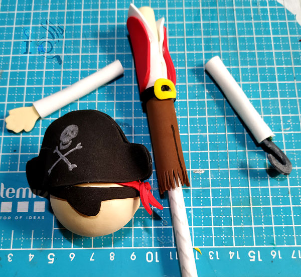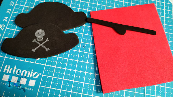 Luego le preparo las piezas para ponerle el pañuelo en la cabeza (que será rojo) y el sombrero pirata, además del parche. El pañuelo lo haremos con un cuadrado rojo porque forraremos la cabeza como antes. Para el sombrero recortaremos dos piezas en negro con la típica forma del sombrero pirata y en una dibujamos las dos tibias y la calavera con un bolígrafo de gel blanco. y el parche con la tira larga que más vale tener que recortar después.