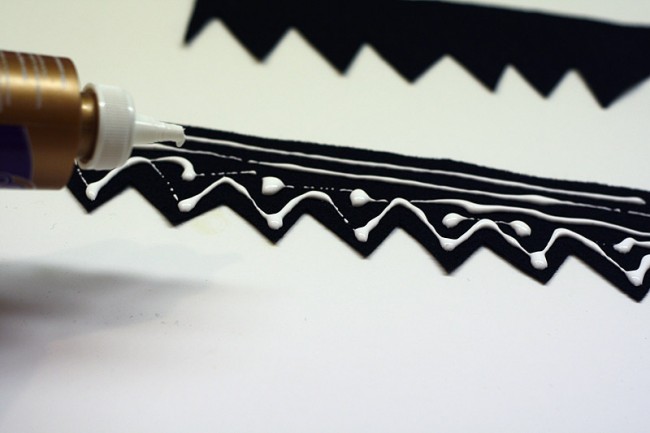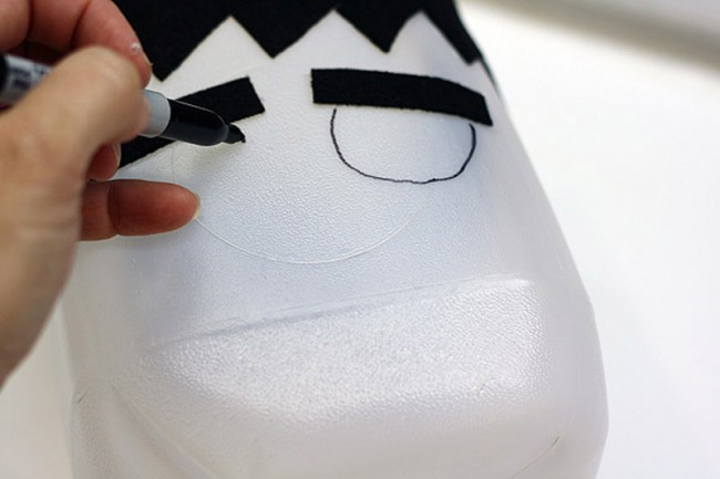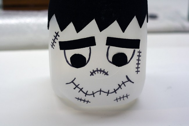 Luego, pegamos el fieltro a la botella, formando la carita de Frankenstein.