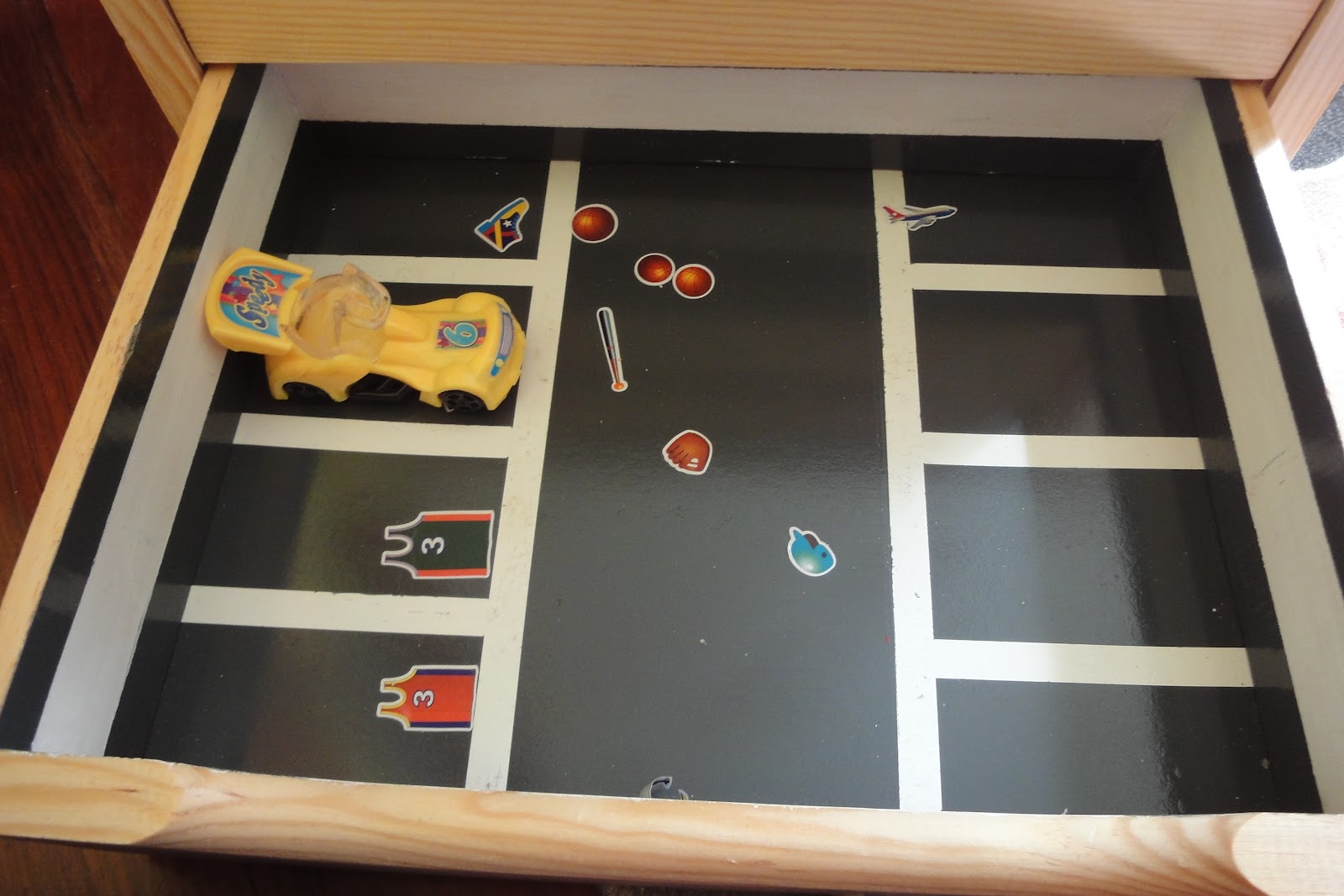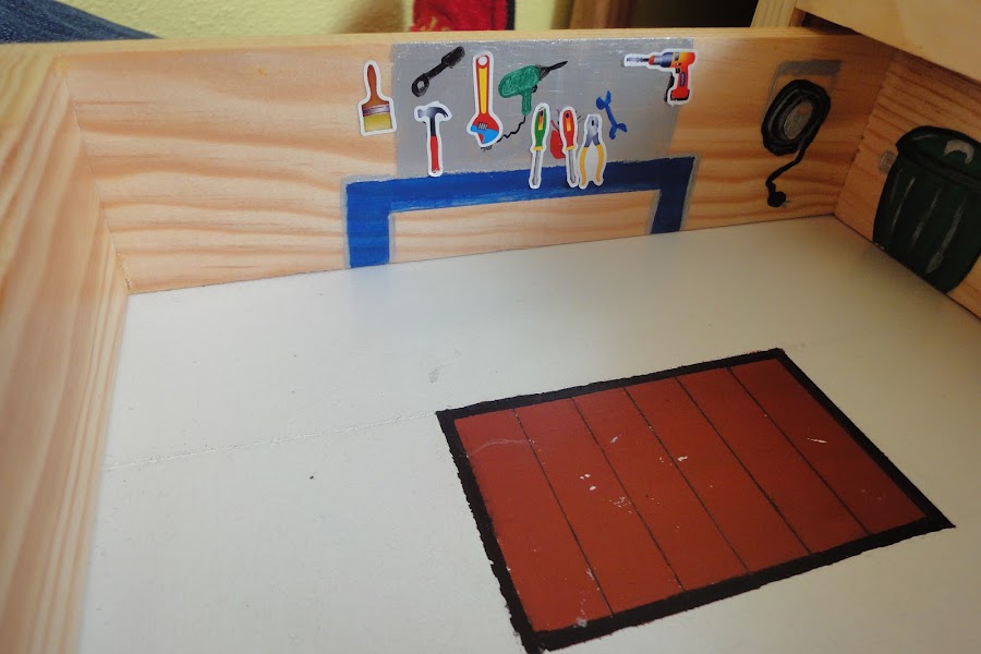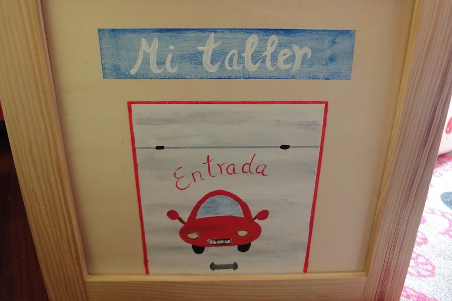 Mi peque llevaba muchisimo tiempo jugando con cualquier cosa, simulando que era un garaje para meter los coches, lo mismo le servia un táper, que una caja de zapatos, que la granja de los little people, le bastaba con sacar las vacas y las gallinas y meter los Rayo Mcqueen y las palas...asi que después de buscar y rebuscar en la red, y de no encontrar nada parecido a un garaje de madera, y por menos de 90e...se me encendió la bombilla, y aqui está! Es una buena manualidad, creo, me costó bastante diseñarlo y pensar como seria todo, y aunque me faltaron mil detalles porque no tuve demasiado tiempo, a él le encantó.