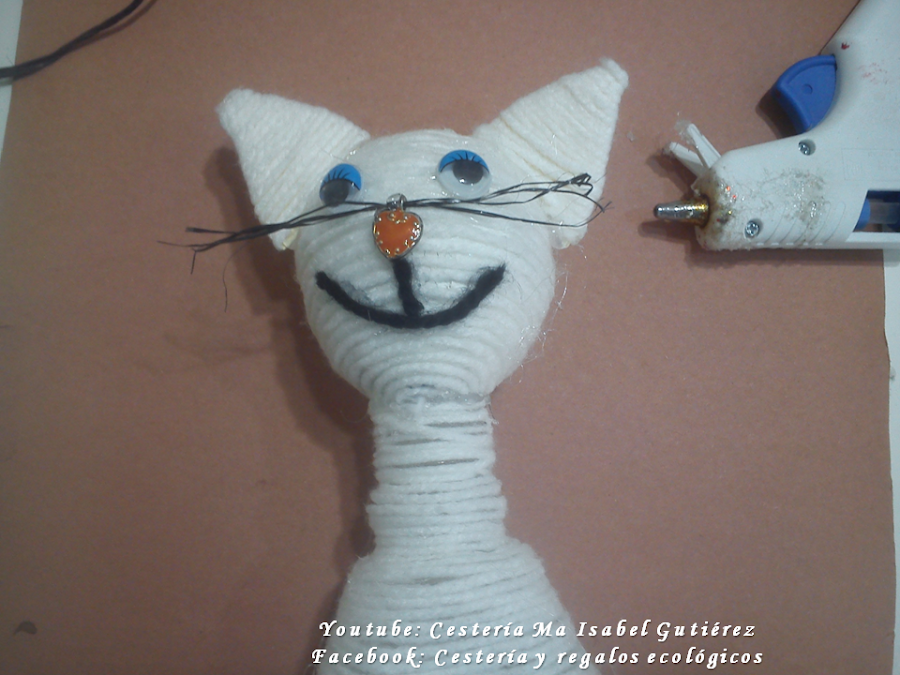 La cara del gato la formamos con dos ojos movibles, aunque también podemos hacerlos con fieltro, para la nariz, estoy utilizando un pequeño dije en forma de corazón (también se puede hacer con fieltro), los bigotes son de hilo plástico negro y la boca la formamos con estambre negro... Pegamos todo esto sobre la cabeza...