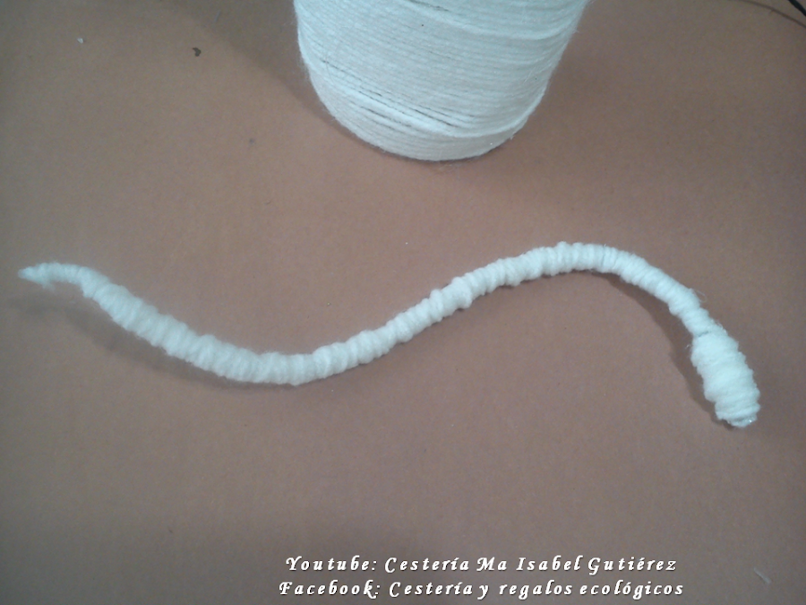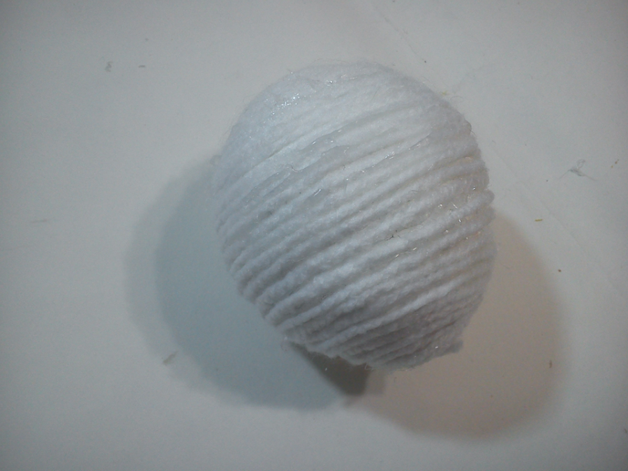 Aparte, formamos la cabeza con una esfera de unicel o telgopor, la forramos con pedazos pequeños de papel y pintamos de blanco, esto es para que el silicón caliente no la deforme y la pintada es para que esté a tono con el color del estambre. También la forramos con estambre empezando por la parte de arriba y enrollando sobre sí mismo el estambre...