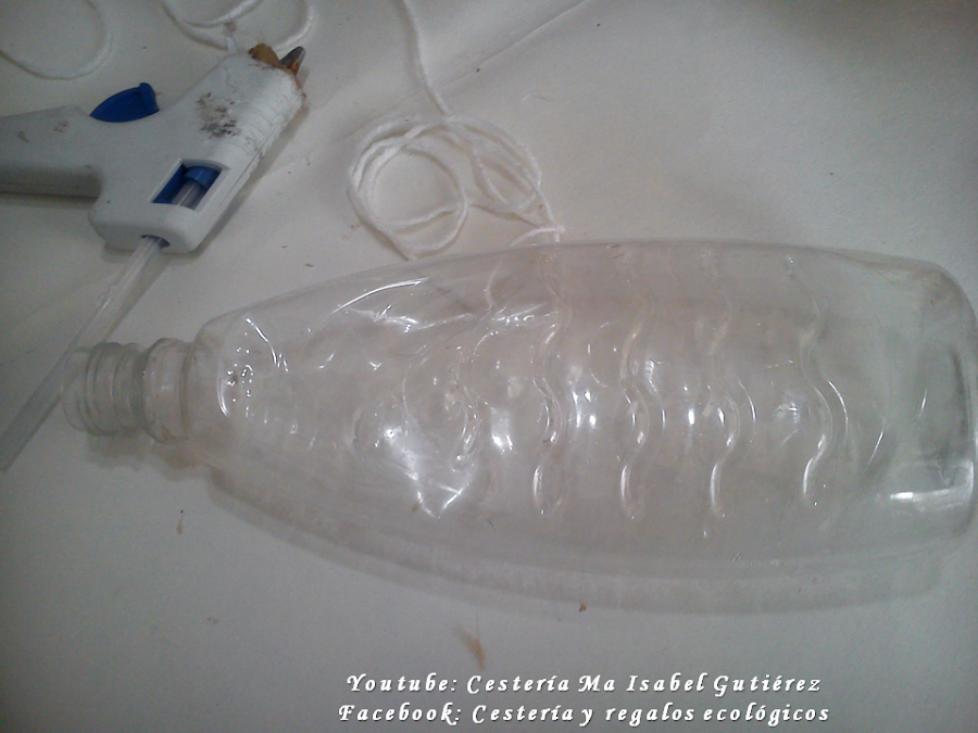 Empezamos a forrar el envase con estambre, pegando con silicón y empezando por la parte de abajo ...