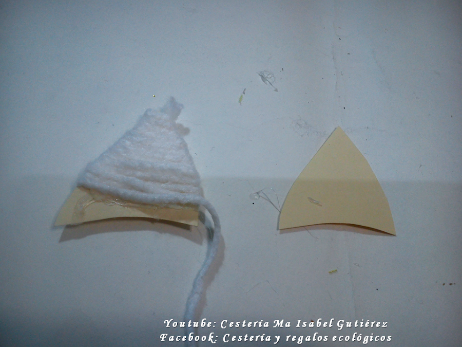 Aparte, para hacer la orejas, cortamos dos triángulos de cartón en tamaño proporcional a la cabeza, redondeando un poco los lados y la parte de abajo para que encaje bien al pegar a la cabeza. También forramos con estambre...