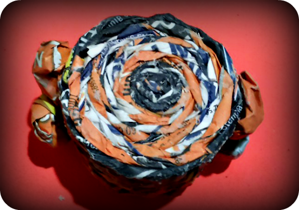 Recorto unas tiras de papel periódico , y los retuerzo un poco , y voy pegándolo sobre si mismo a modo de espiral