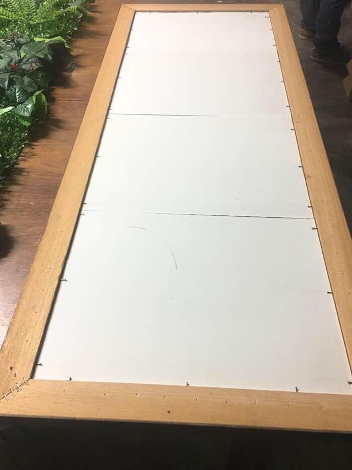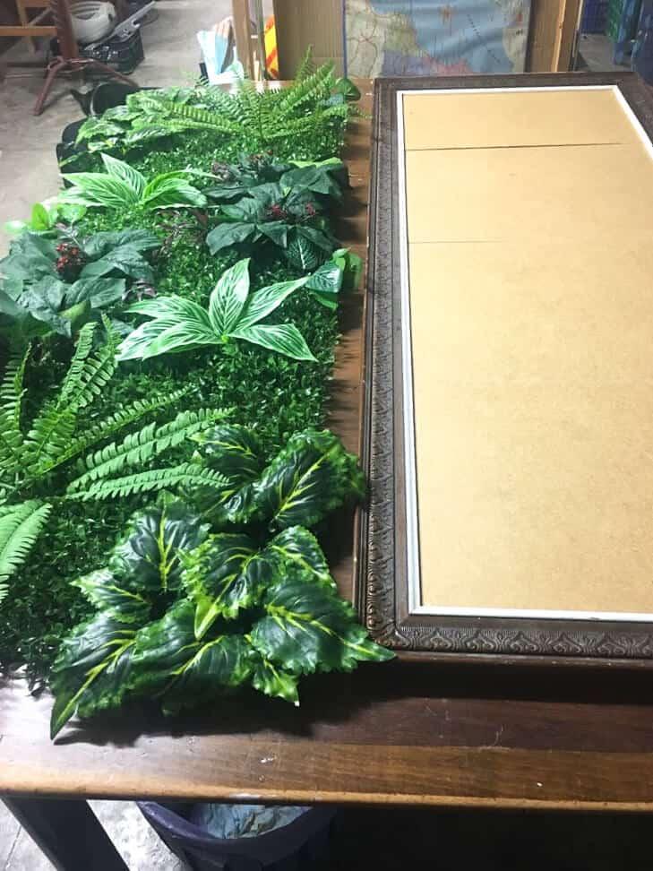 Primero de todo estuvimos ojeando las placas de jardín vertical en algunas tiendas y al final las compramos por internet en Dheli ¡Ni más ni menos! En pocos días ya lo teníamos en casa, en internet se encuentran precios buenos, se pierde tiempo buscando pero lo bueno es que no tenemos que movernos. Este ha sido el único gasto que hemos hecho, lo demás ha sido material reciclado y tiempo invertido.Para hacer el marco nos ha servido reciclar el marco de un tapiz antiguo que rescatamos de una casa vieja, el marco lo hemos desmontado y hecho a medida, luego lo hemos pintado en blanco decapado y envejecido, la parte que va pegada al jardín son chapas finas recicladas de melamina, el lado blanco lo hemos puesto hacia detrás y el lado de color madera hacia delante, este lado luego lo hemos pintado de color verde, el jardín vertical tapa el color verde por completo pero así nos aseguramos de que por ningún hueco se vea otro color. Por último el jardín lo hemos pegado con pegamento caliente, que nosotros gastamos a menudo como he comentado en alguna de mis entradas anteriores.