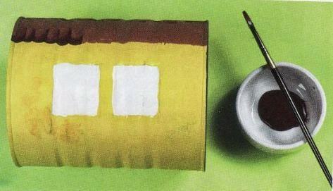 Luego de que la pintura haya secado, transfiere el diseño del tren a las latas (usa papel calca o cárbonico).Pinta de amarillo el vagón y la locomotora, luego pinta el techo de rojo, marca las tejas con un pincel.