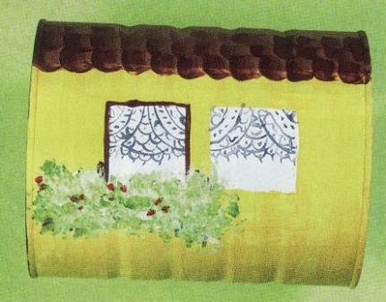 2.-Delinea las ventanas con rojo y pinta las cortinas con acrílico grís.Pinta el follaje debajo de las ventanas con la punta de un pincel y acrílico verde.Pinta puntos rojos como flores.