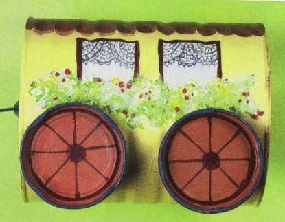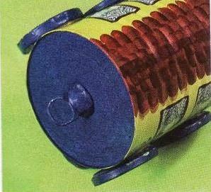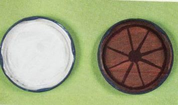 Usa las tapas de las mermeladas con convertidor de óxido blanco.Una vez secas colorealo con acrílico naranja y los rayos con rojo.Pega las ruedas a cada lado de la lata.