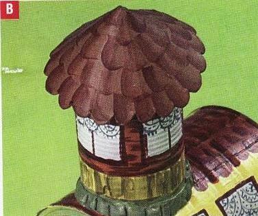 B.-Corta un círculo de cartón de 16 cm de diámetro, y quitale un cuarto del círculo.Adhiere los lados rectos entre sí para formar un cono.Pinta de rojo simulando las tejas y pega sobre la chimenea.