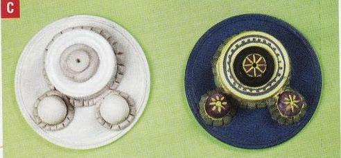 C.-Pega 2 botones grandes sobre una tapa de paté y ubicala en el centro de la tapa de plástico del juguete.Corta el mango de 2 cucharas de plástico y pega el resto, como luces.