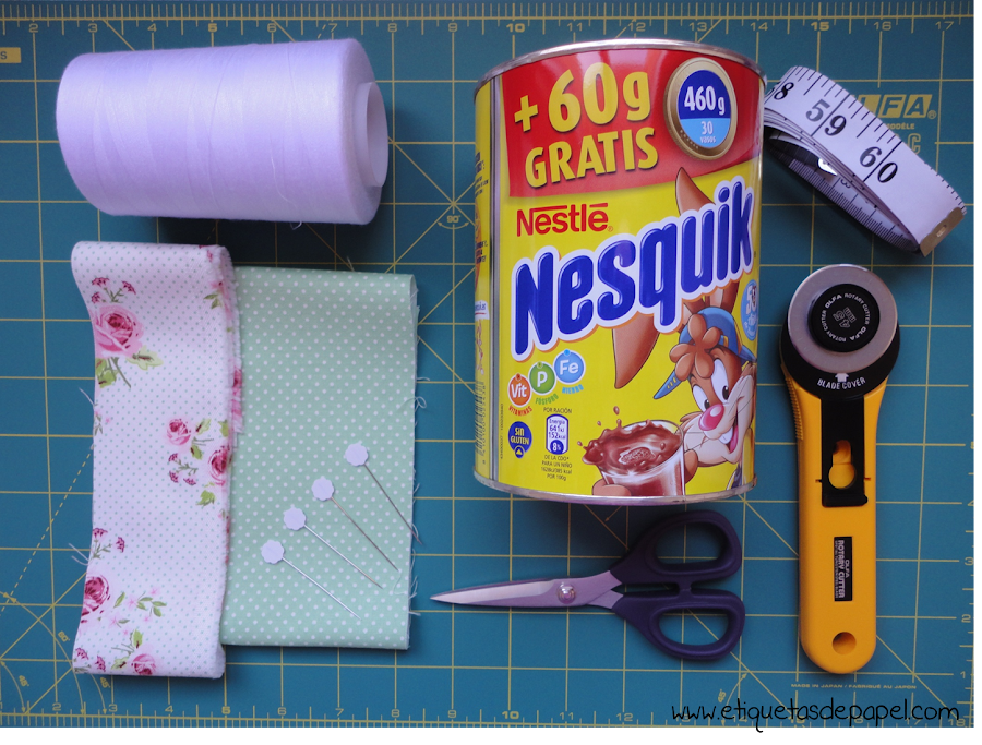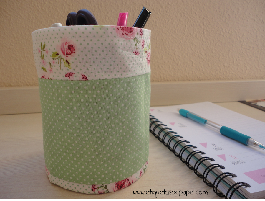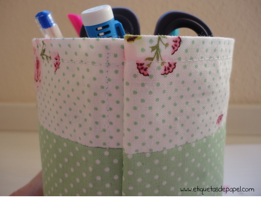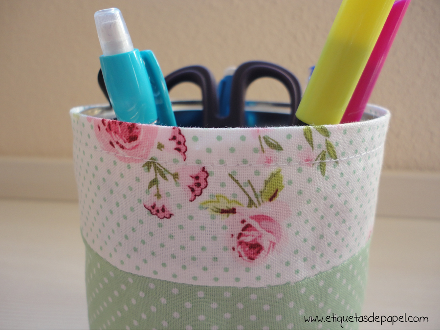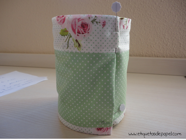Una vez lo tengamos casi todo a punto, haremos una prueba con alfileres alrededor de nuestra lata. Si todo está bien, coseremos a máquina la parte que cerrará la lata (donde veis las alfileres) por la parte interior.