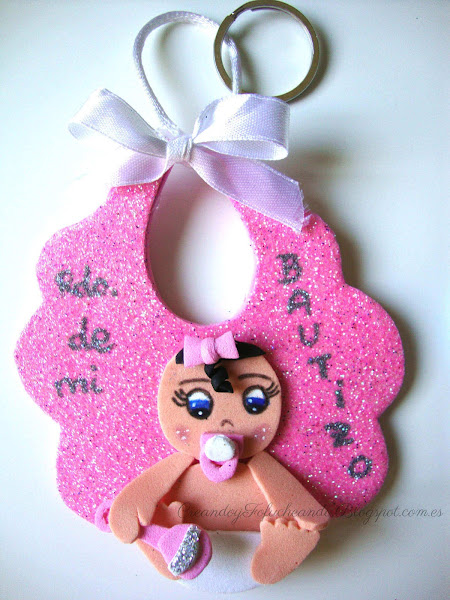 Con la leyenda me pasa igual. He optado por poner Recuerdo –abreviado- de mi Bautizo,pero evidentemente, queda mucho mejor personalizarlo con el nombre del pequeño o la pequeña,así como la fecha de ese día tan especial,o también dejarlo sólo con el muñequito de goma eva,y añadir una tarjetita con la leyenda...eso ya según los gustos.
