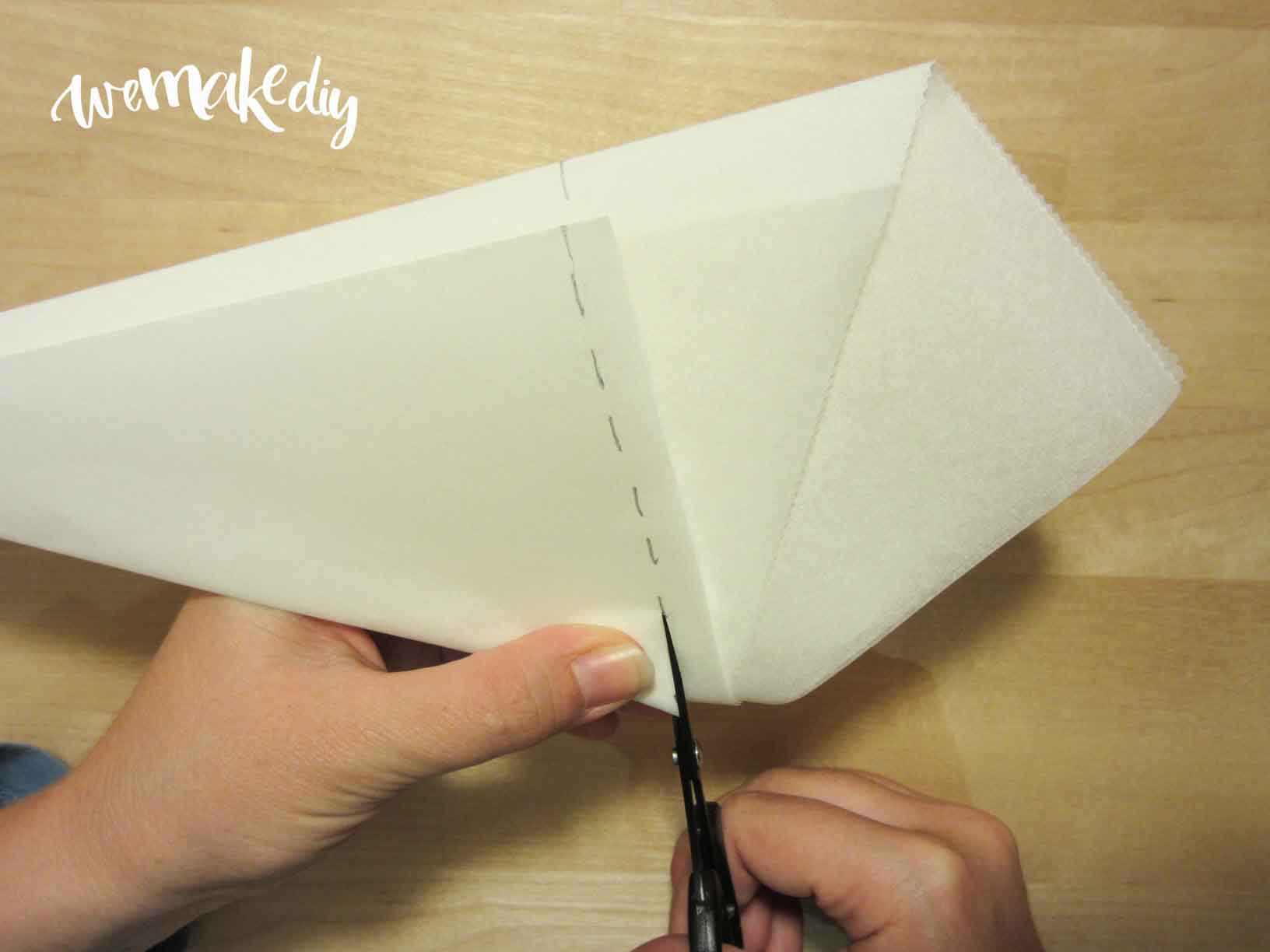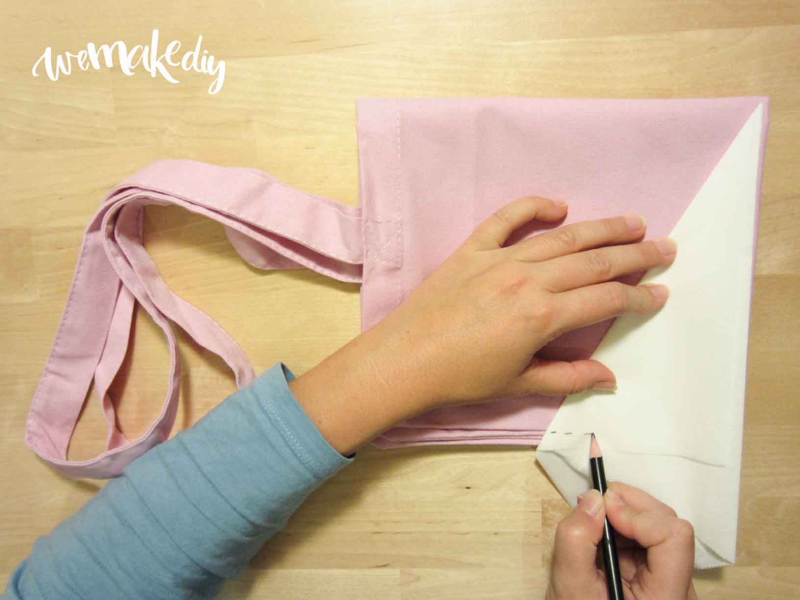 Para que el mandala encaje perfectamente en tu proyecto, debes tener en cuenta que hay que recortar el "cucurucho" para que trabajes con la medida adecuada. Por ejemplo, en nuestro kit de Bolsa de Tela, lo que hacemos es doblar la bolsa un par de veces y sobre uno de los lados tomamos la medida que necesitamos.