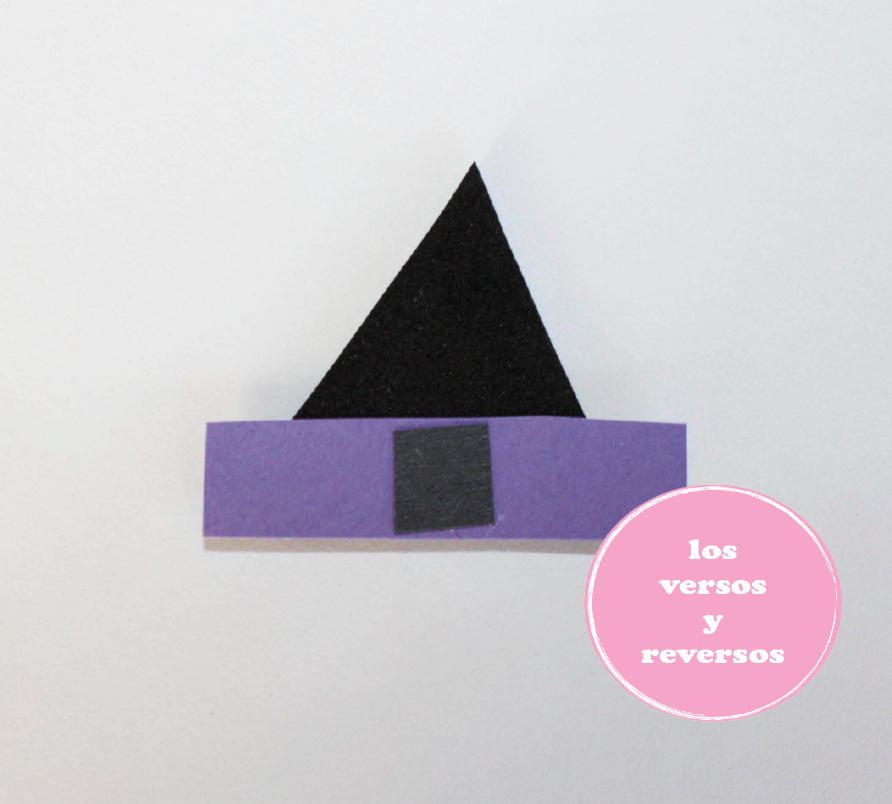 Con el fomi negro, haz un pequeño triángulo que será el sombrero. Para decorarlo, recorta un rectángulo morado y pégalo en la base y al centro pon un cuadrado negro.