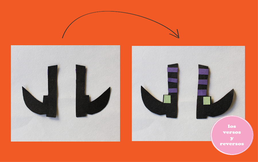 A las piernas de la bruja ponle pedacitos de papel morado y un cuadrado verde al centro del zapato.