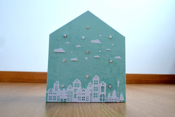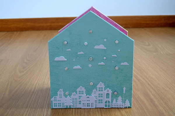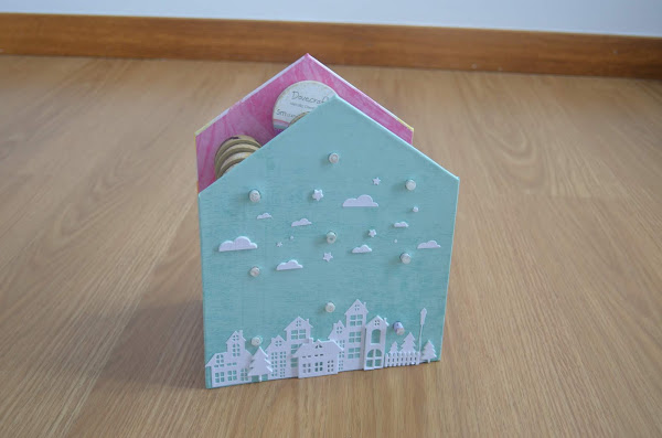 ¿Has visto qué fácil es? Puedes decorarlo a tu gusto, con los motivos que prefieras, o incluso pintarlo. Como tiene forma de casita, yo opté por decorarlo con unos troqueles en forma de casas con los que forme una pequeña ciudad. A algunos les di relieve cortando las mismas formas en goma EVA y pegándolas detrás de los troqueles de cartulina.