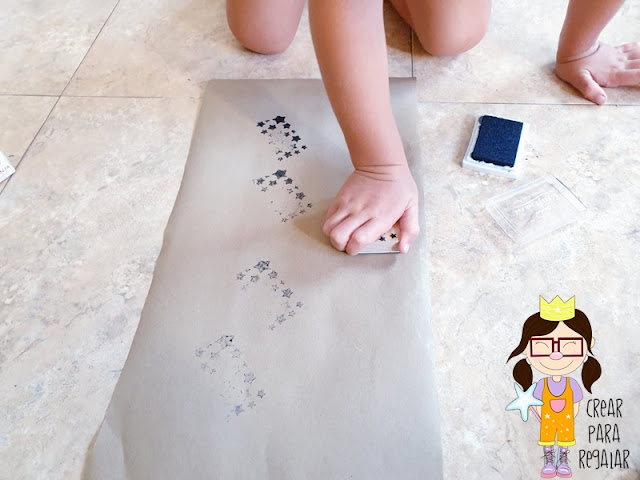 Extendimos el papel craft y Gael lo fue decorando con sellos en forma de estrellas. La decoración puede tener multitud de variantes, con mirar lo que tienes por casa tendrás suficiente ¡imaginación y creatividad!