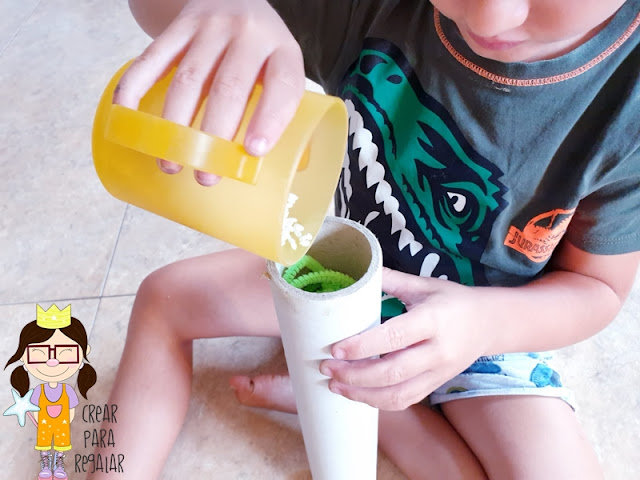 Ahora ponemos arroz. Puedes usar un embudo también, si no quieres que el arroz se reparta por todo el suelo. De lo que se trata es de disfrutar del proceso así que si se cae por fuera, el cepillo y la pala lo arreglará todo.