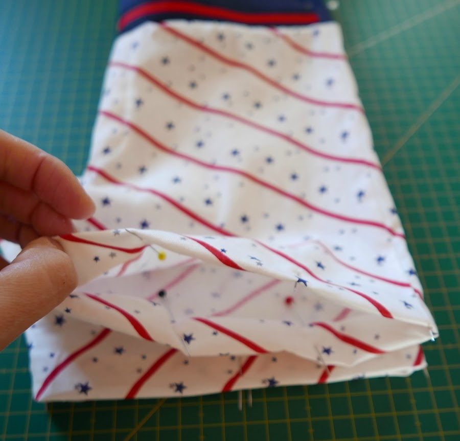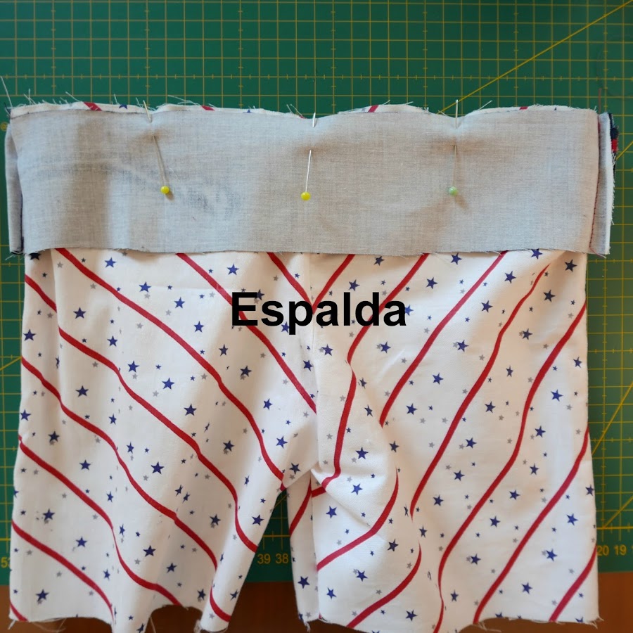 Ahora doblamos la cintura, con la goma ya colocada dentro. Lo vamos sujetando con alfileres: