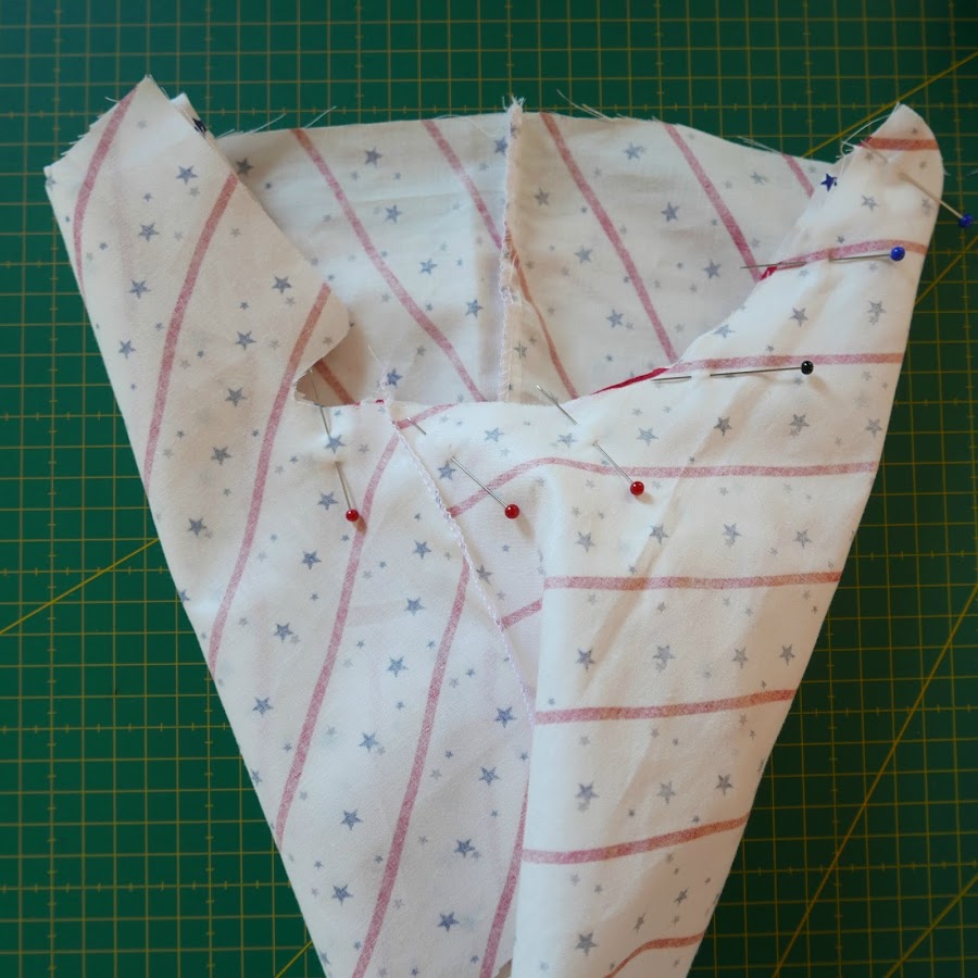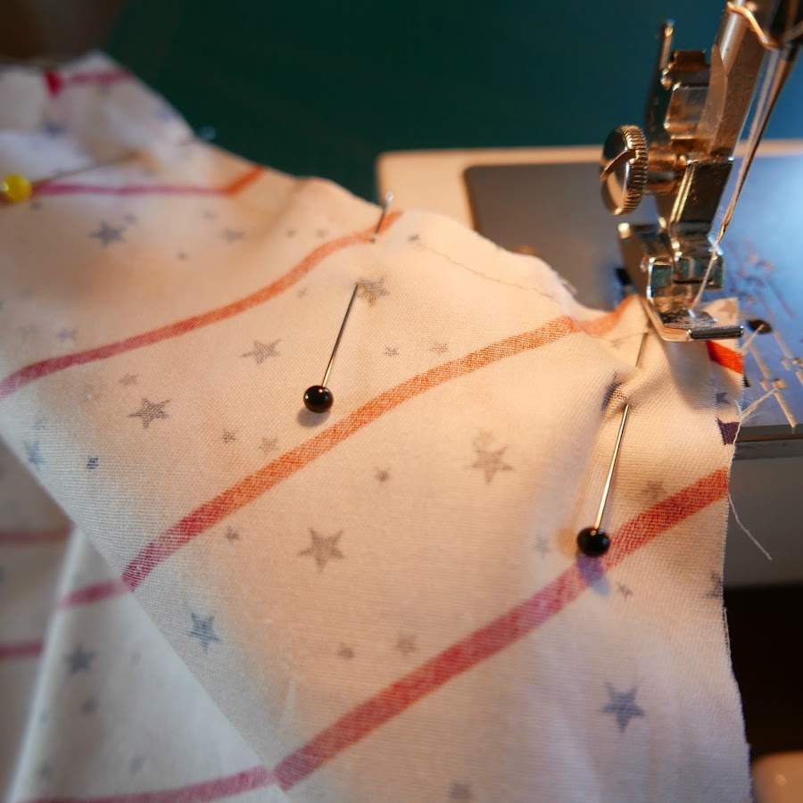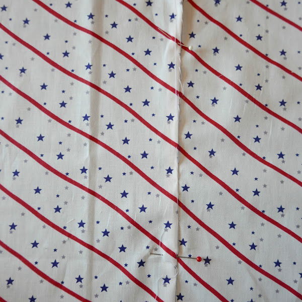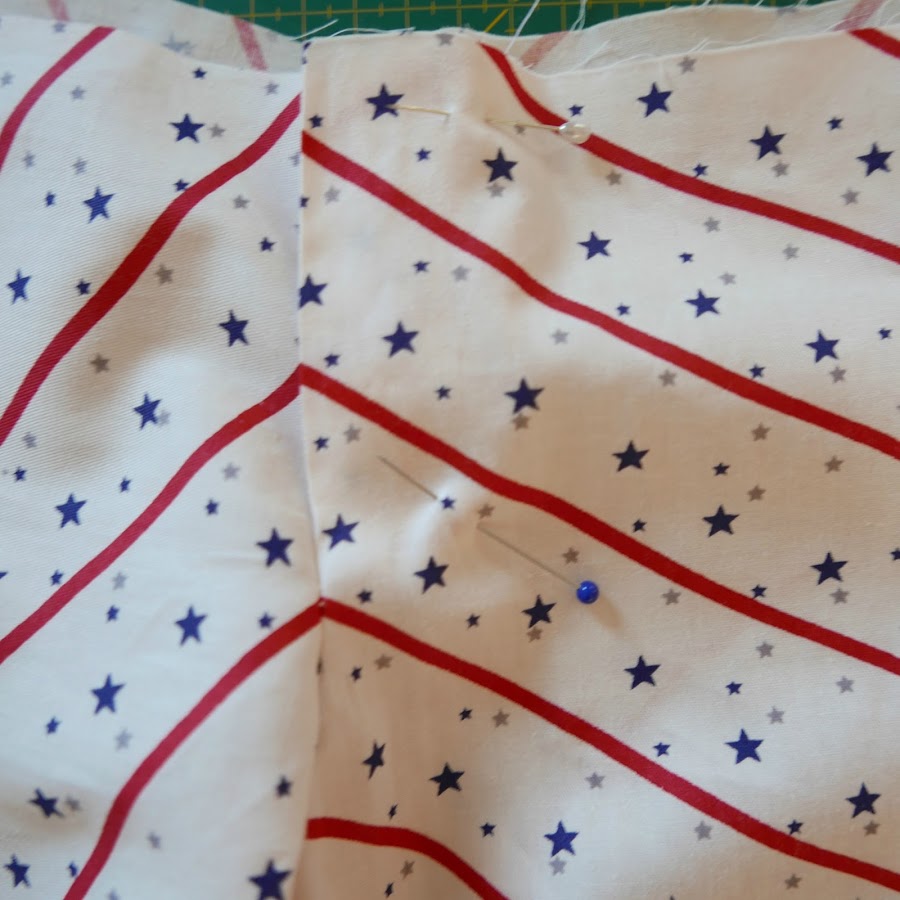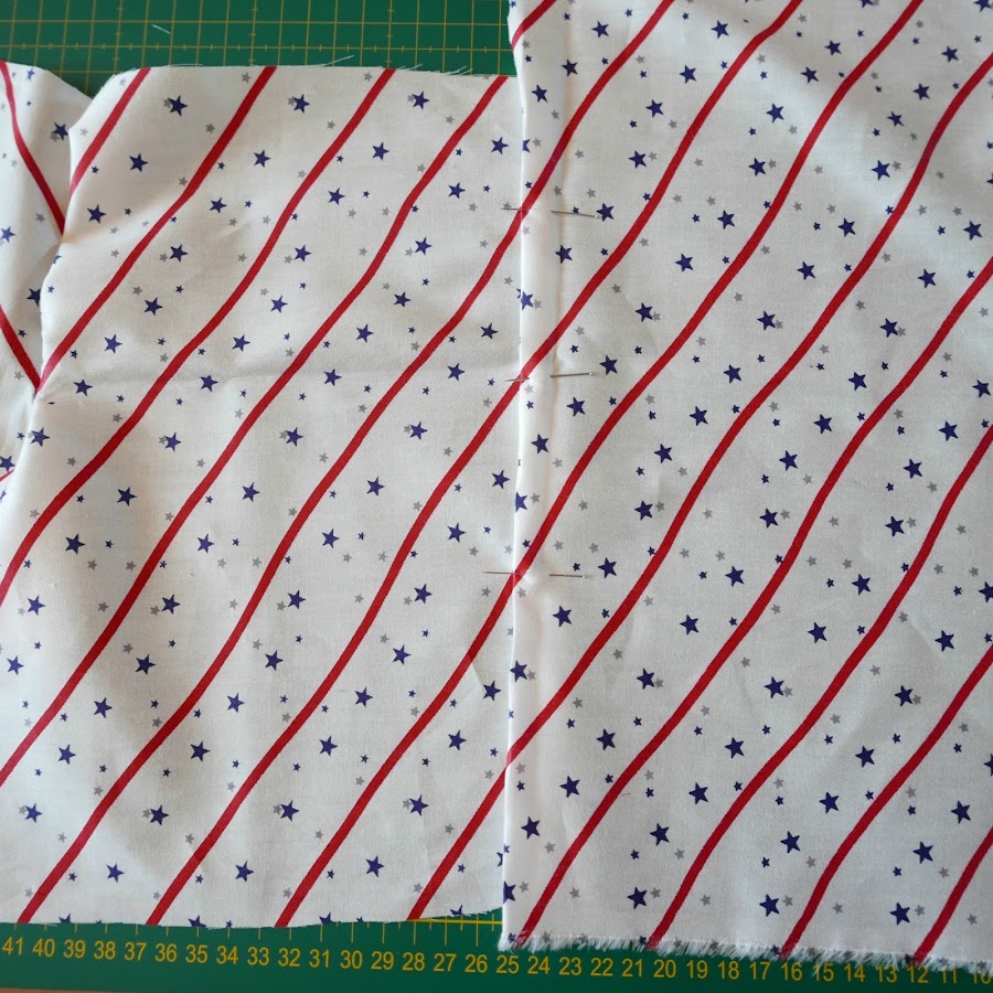 Ahora si os fijáis en la zona de la unión de las rayas, he colocado un alfiler vertical. De este modo nos aseguramos que la tela no se se desplaza. Para asegurarnos de que coinciden, miramos a trasluz como se ve en la foto.