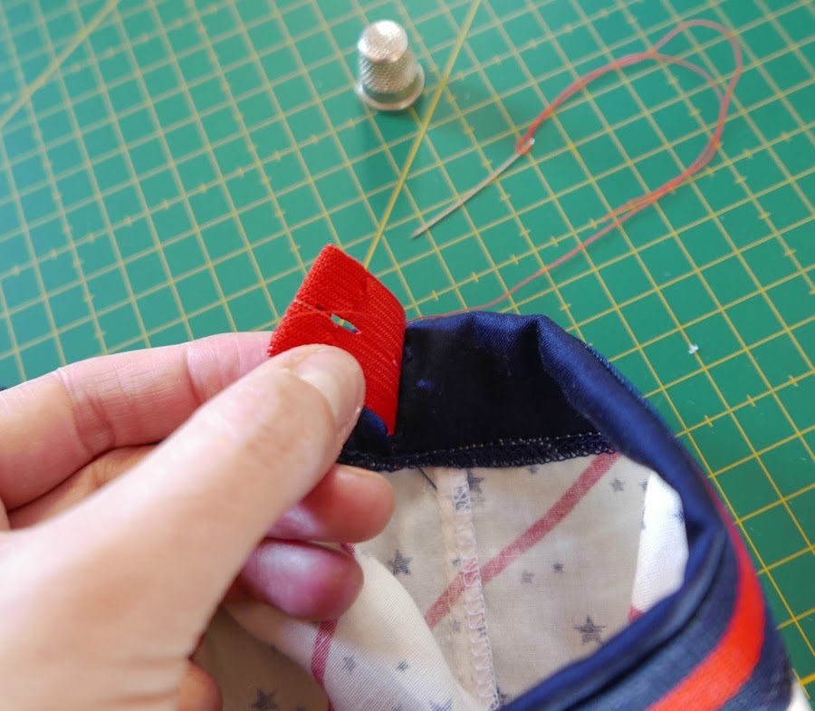 Cosemos los extremos de la goma de ojal, con pequeñas puntadas a mano.