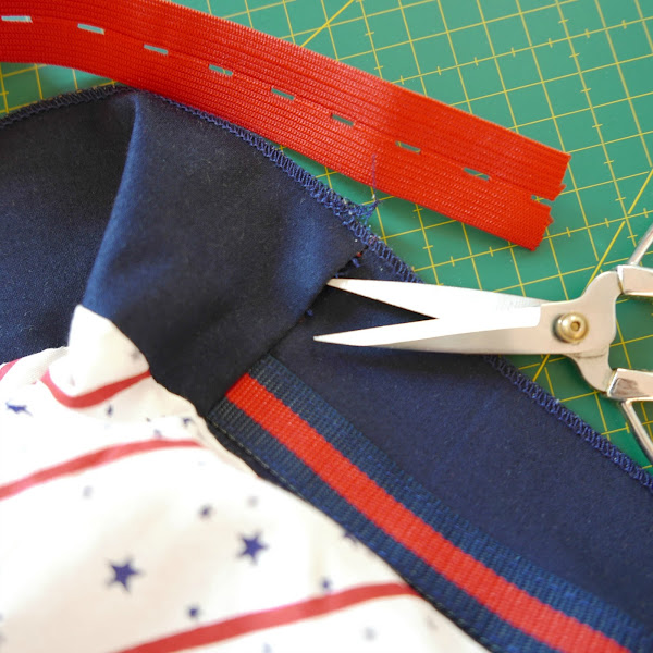 Y cortar la goma de ojales, como veis la dejaremos más corta para que quede fruncida: