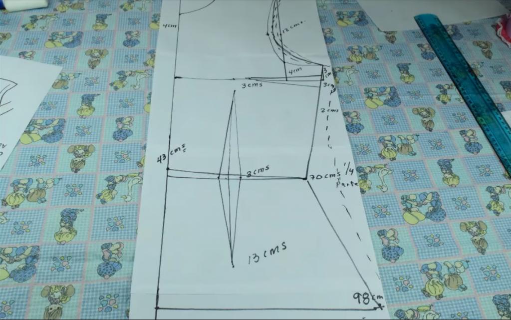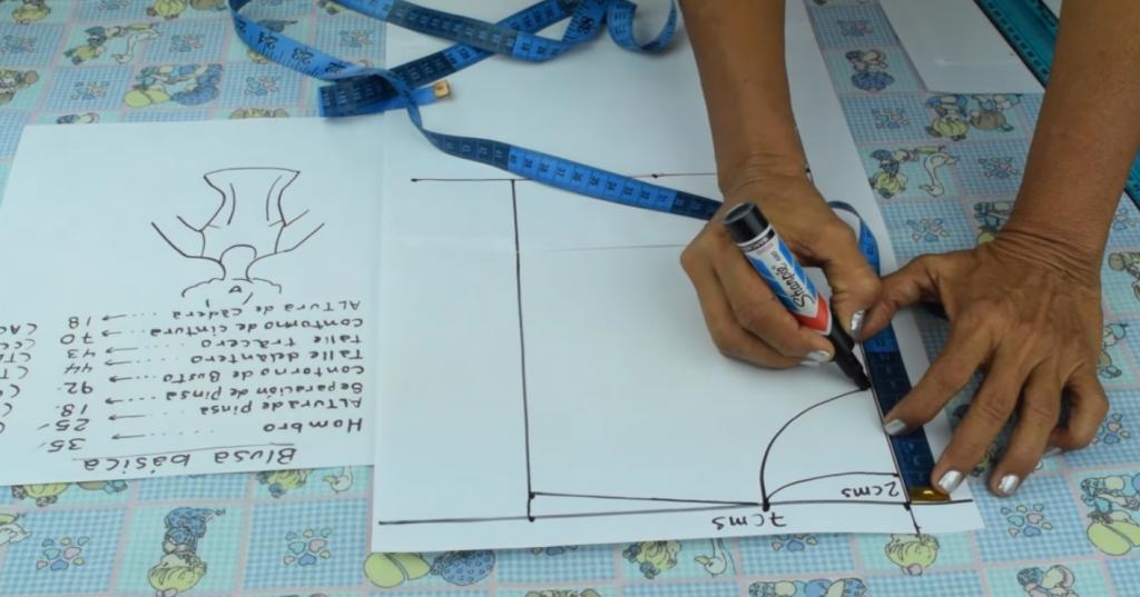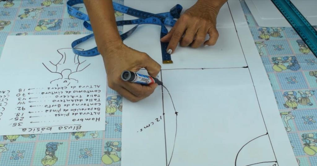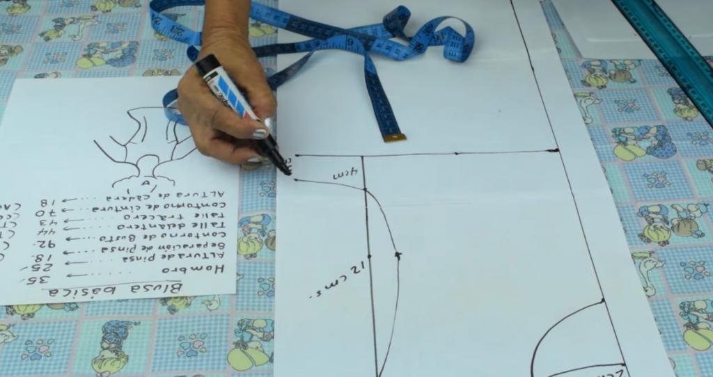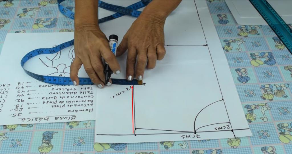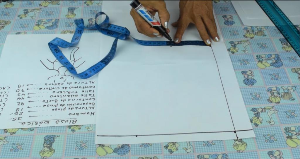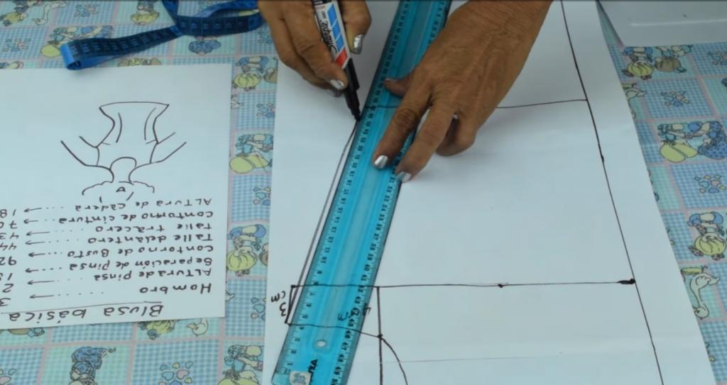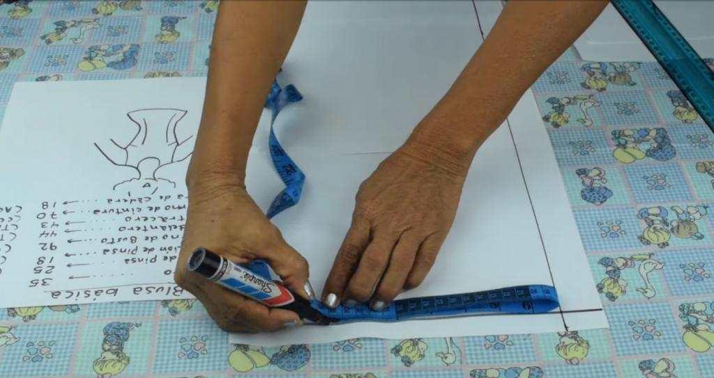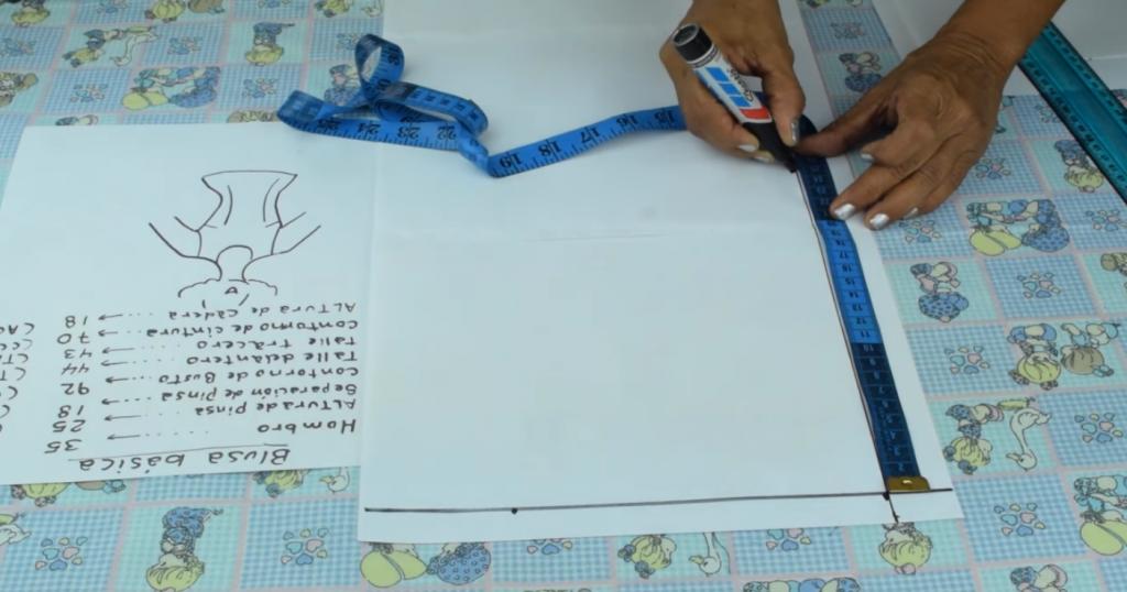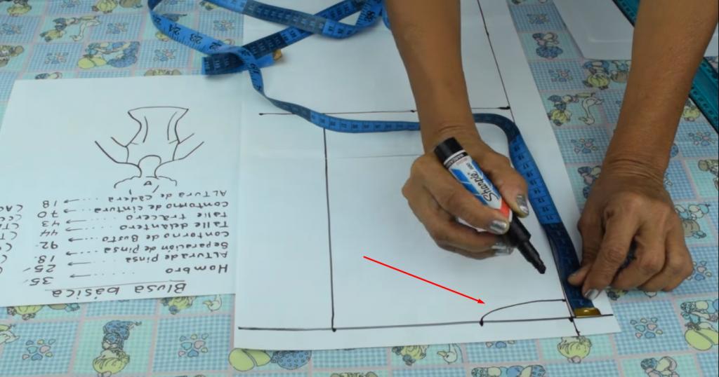 Lo siguiente que vamos a hacer es seguir marcando y trazando las medidas correspondientes para la confección del patrón de la blusa.