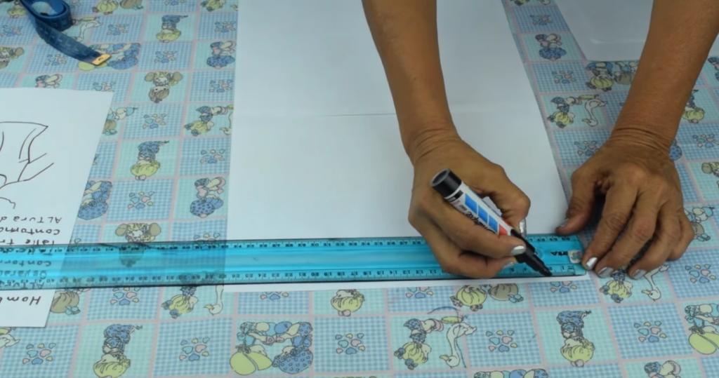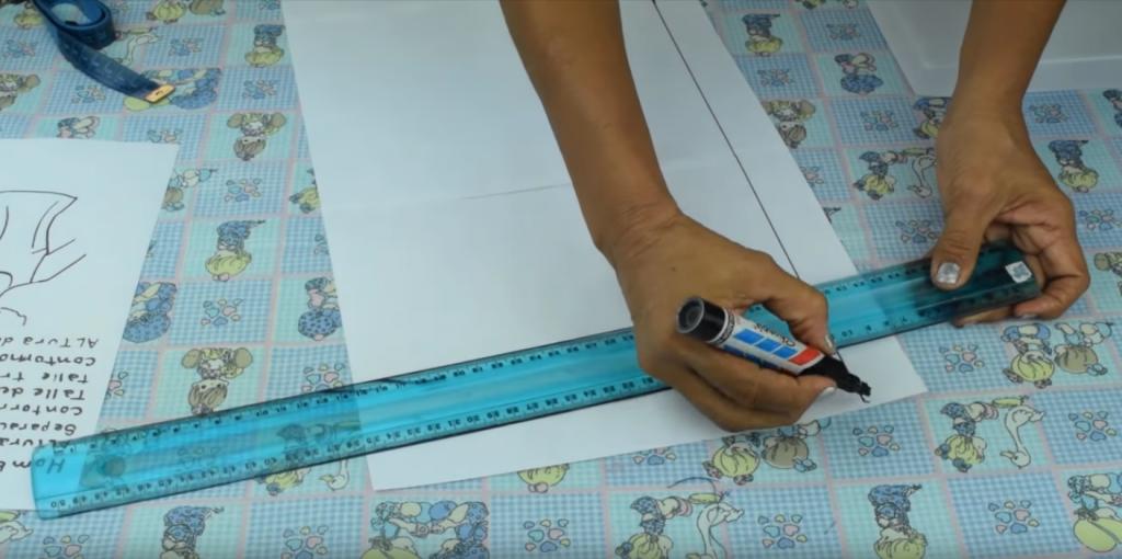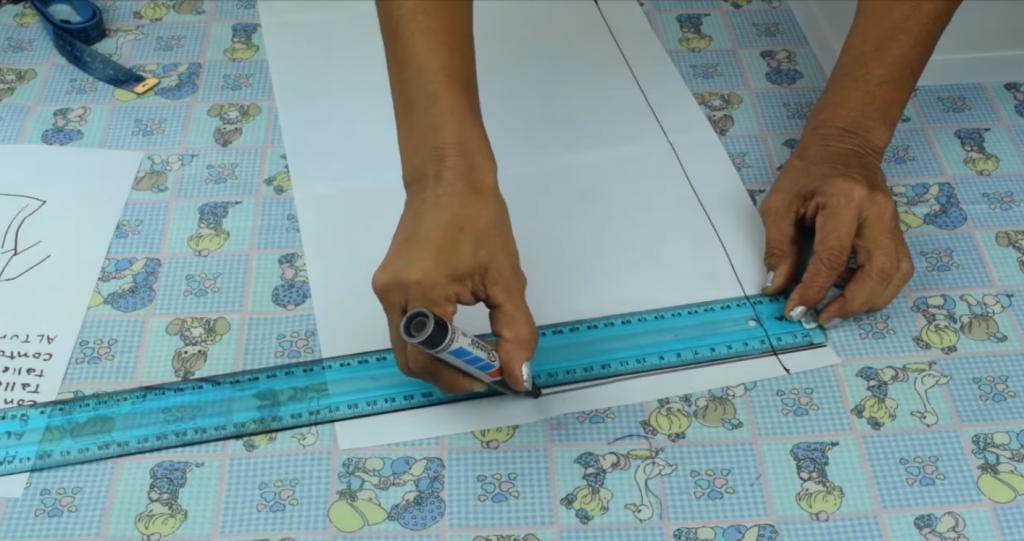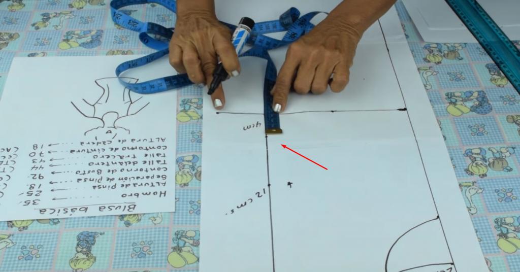 Vamos a medir 12 cm y realizamos un punto de referencia con el marcador, te recomiendo que en cada medida que realices realices puntos de referencias y luego trazas, esto, para evitar que te equivoques y tengas que realizar completamente el patrón de nuevo.