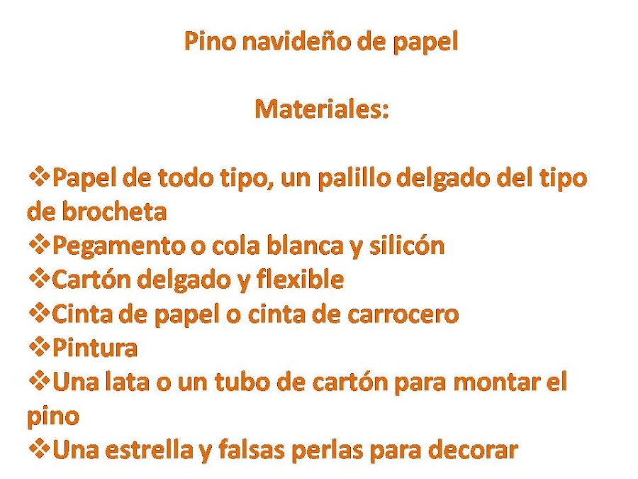 Se cortan tiras de papel de aproximadamente 7 cms., de ancho, el largo de las tiras puede ser desde 7 a 20 cms. Ponemos pegamento o cola blanca a lo largo de una orilla de la tira, por la otra orilla acomodamos el palillo un tanto inclinado y empezamos a enrollar... se retira el palillo...La cantidad de tubitos o varillas de papel depende del tamaño del pino que desees...