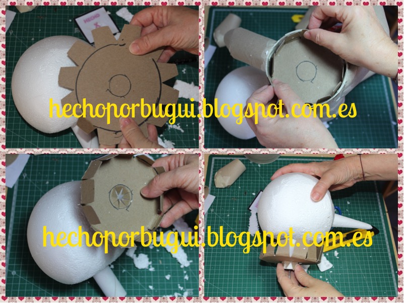 Con un trozo de cartón dibujamos un circulo dos centímetros mas grande que la circunferencia del cuerpo. Dimos forma haciendo unos cortes a modo de solapas y también perforamos el centro en forma de estrella.