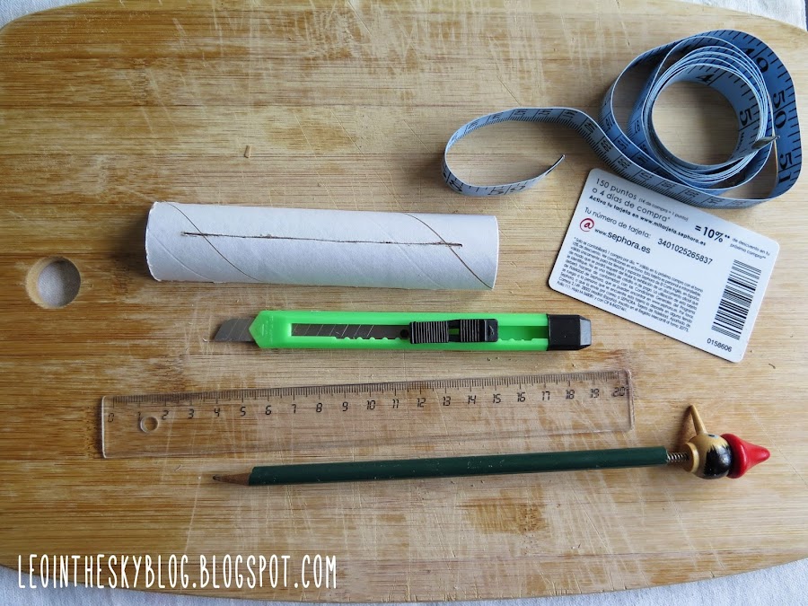 para medir el centro del medio tubo me ayudé de una cinta métrica de las de costura que es flexible y así acomodándola al contorno del tubo fue mucho más fácil señalar el punto medio y hacer posteriormente una línea con la regla, por donde luego pasaría el cúter.
