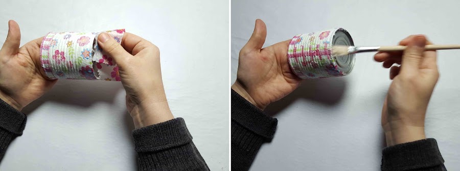 Se aplica cola blanca a la lata y se pega la servilleta. Después se aplica cola blanca encima de la servilleta con mucho cuidado para no romper la servilleta. Se sigue aplicando cola a la lata y se repite el mismo proceso hasta acabar de cubrir toda la lata.
