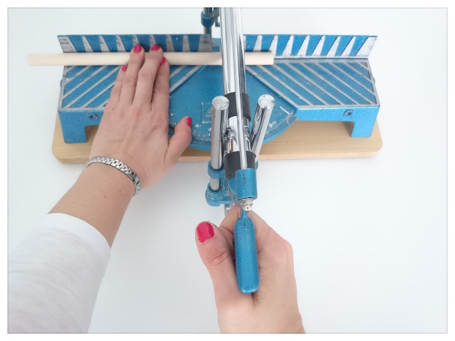 El primer paso es cortar los listones de madera de pino redondos, con una sierra para madera, a una medida de y utilizando una sierra ingletadora de mano, cortar también los listones de madera de pino,