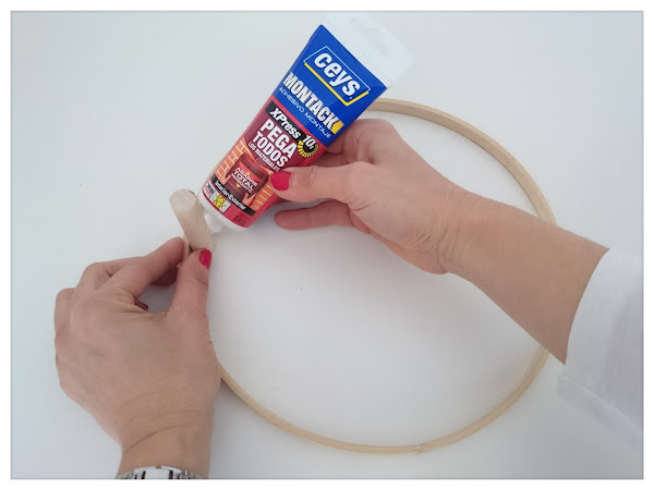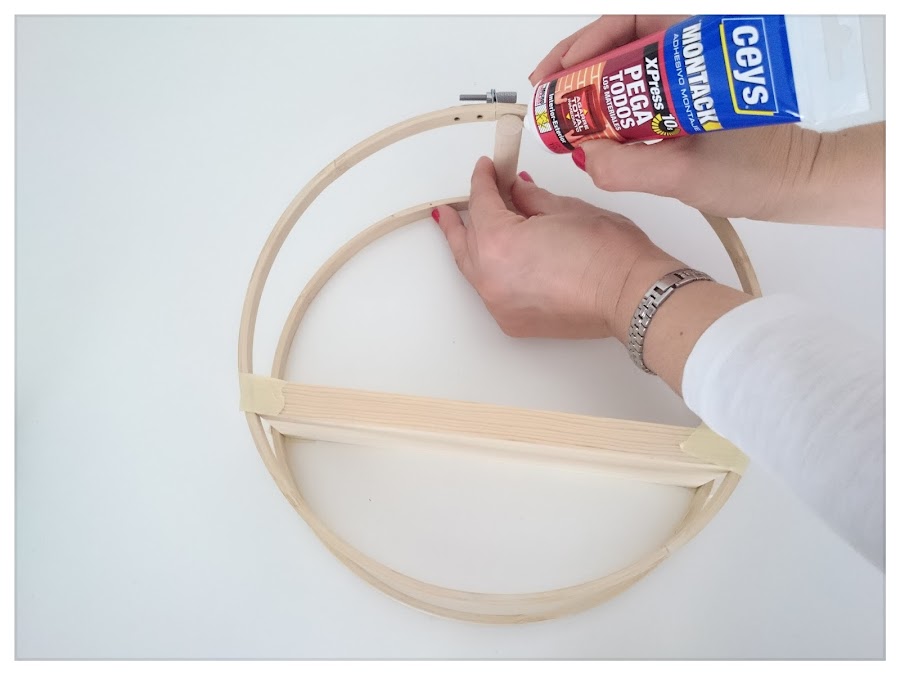 Separar el bastidor en los dos aros y con el adhesivo montack, hechar unos puntos generosos presionando el bote y pegar a la mitad del bastidor