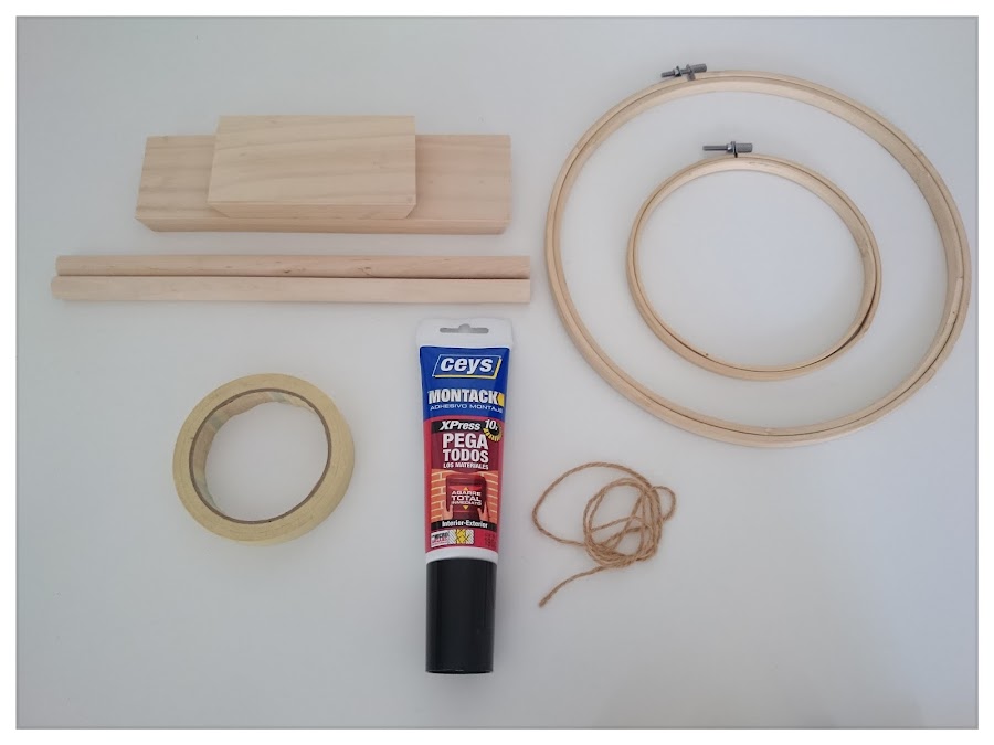 Atar un trocito de cuerda de esparto, en el listón redondo de madera para poder colgarlos.