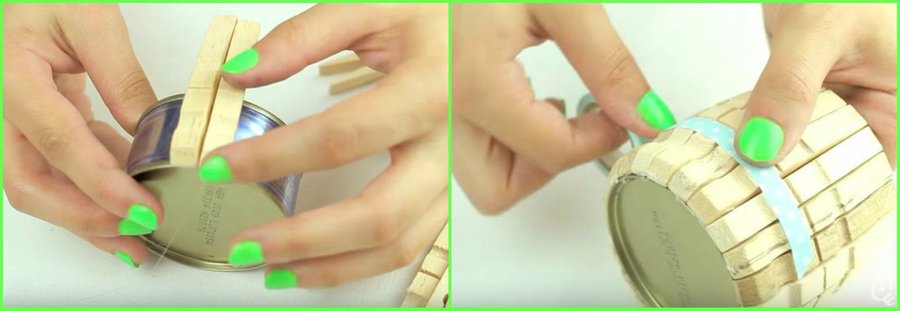 Comienza separando las mitades de las pinzas de la ropa para crear unidades individuales. Cuando los tengas, comienza a pegarlas con silicona caliente alrededor de la lata. ¡Hazlo por el mismo sitio!