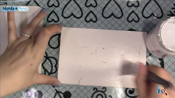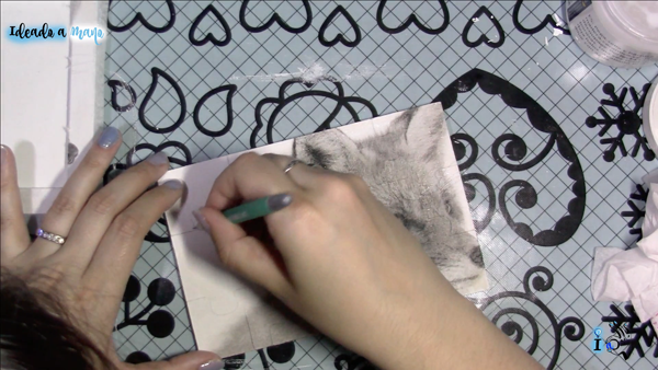 Luego hago decoupage en la parte de abajo del puzle, dónde se van a colocar las piezas, con el mismo motivo y haciendo coincidir los motivos con los del borde del puzle. Y luego se corta el sobrante con la cuchilla.
