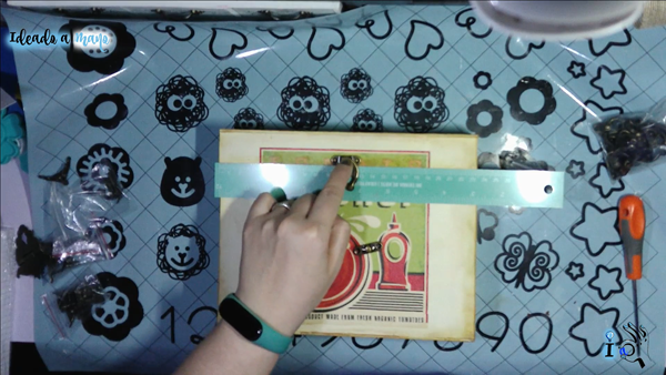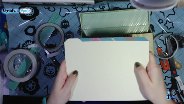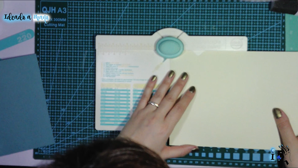 Mientras seca el barniz preparo los separadores interiores. Para ello recorto papel de scrap del mismo ancho que las fichas en las que escribo las reccetas pero 1cm más altas. Y voy a hacer unas pestañas de separador utilizando la máquina de hacer sobres de WeRmemory Keepers. Quería enseñaros cómo se hace con esta máquina, porque mucha gente no sabe que sirve también para esto, aunque en realidad se pueden hacer a mano o con otra máquina que hay más especializada en esto. Os recomiendo que para aprender veais el vídeo porque es muy dificil de explicar en palabras solo.